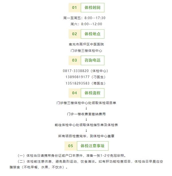 根据四川省卫生健康委员会、四川省财政厅、四川省农业农村厅、四川省市场监督管理局、四川省药品监督管理局联合印发的《关于进一步做好从业人员预防性体检工作的通知》(川卫规〔2023〕2号)文件要求,经研究决定,从2023年4月1日起,区疾病预防控制中心不再承担从业人员预防性体检工作,此项工作由高坪区人民医院等4家医疗机构继续承担(详见附表)。