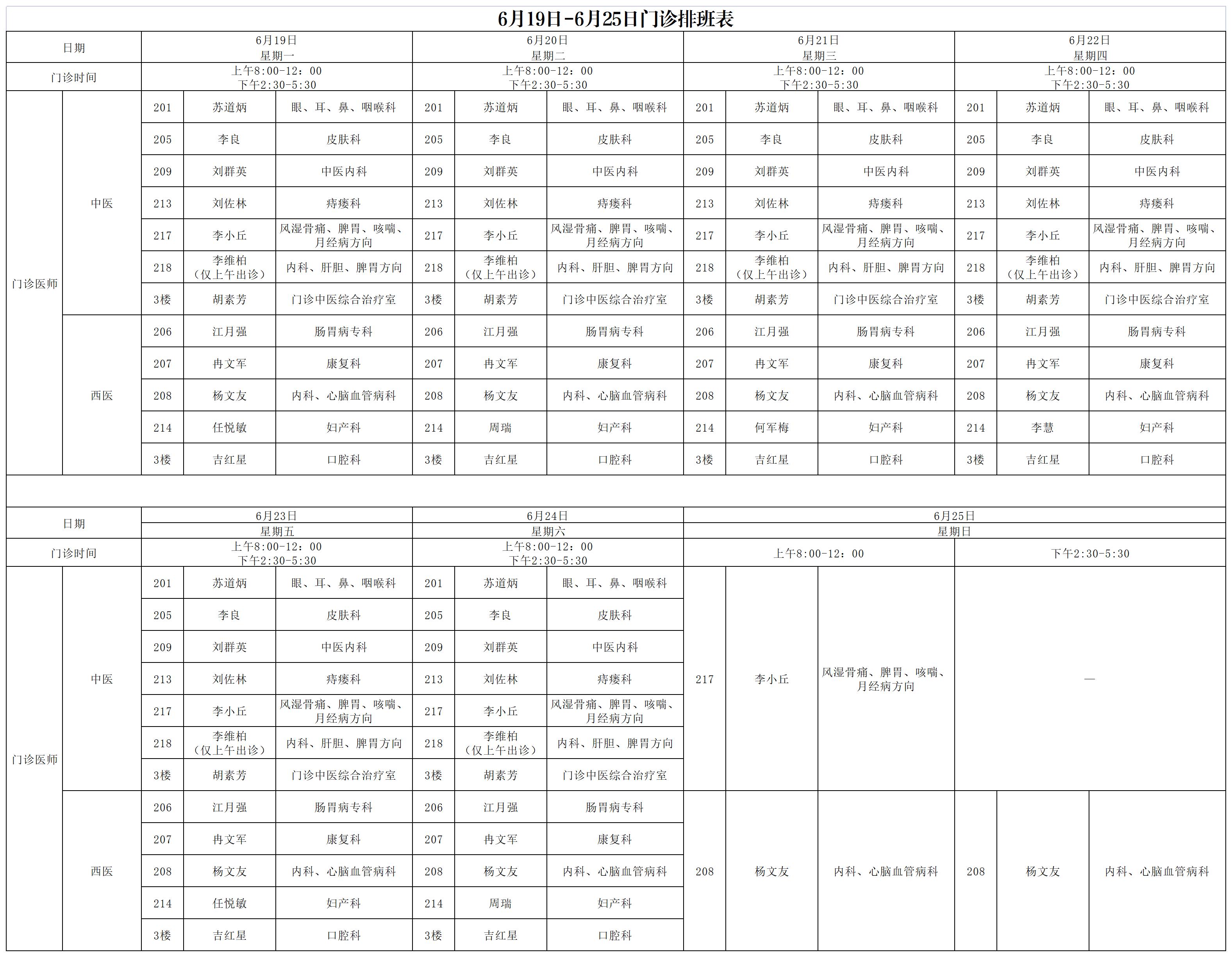6月19日-6月25日门诊排班