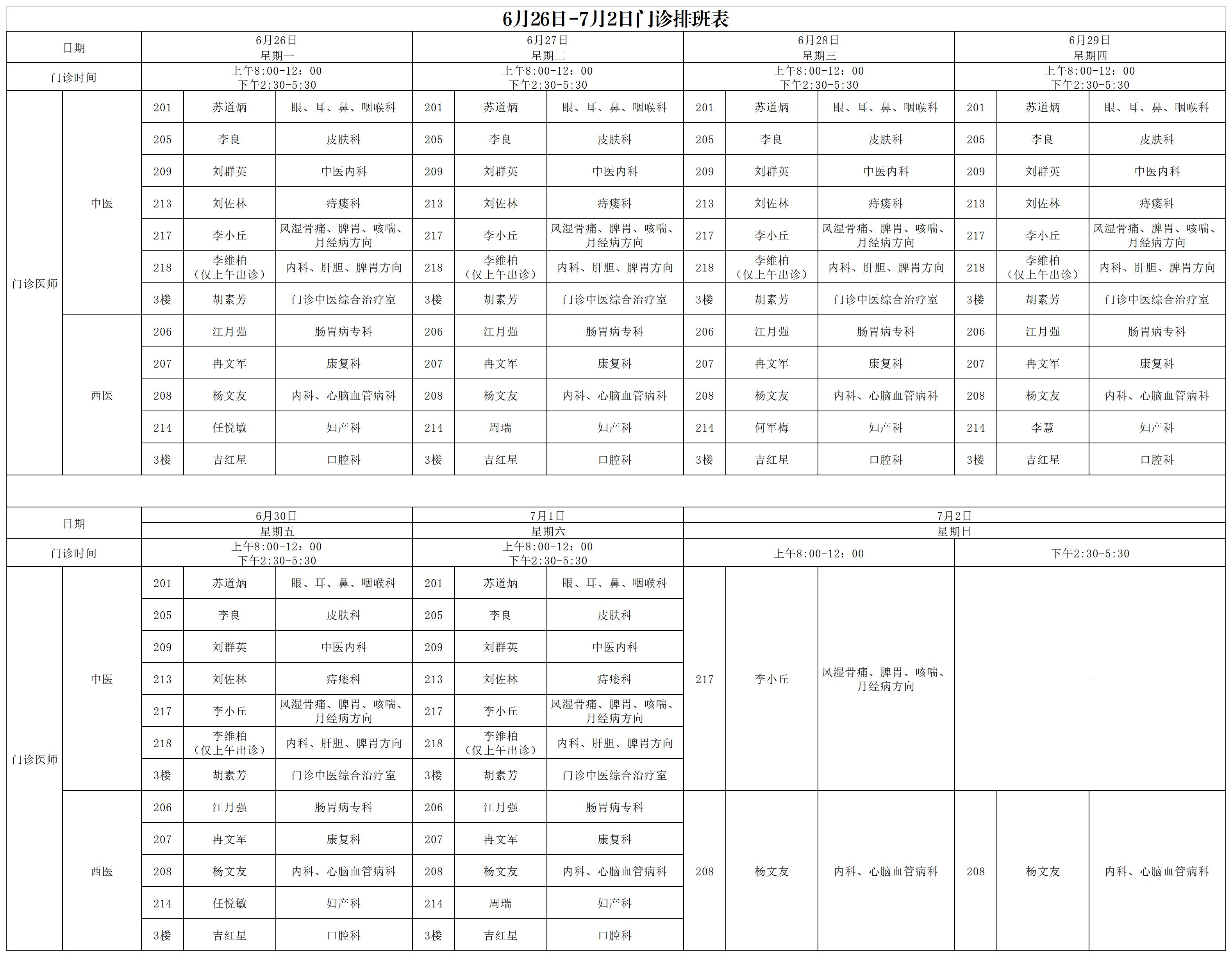 6月26日-7月2日门诊排班