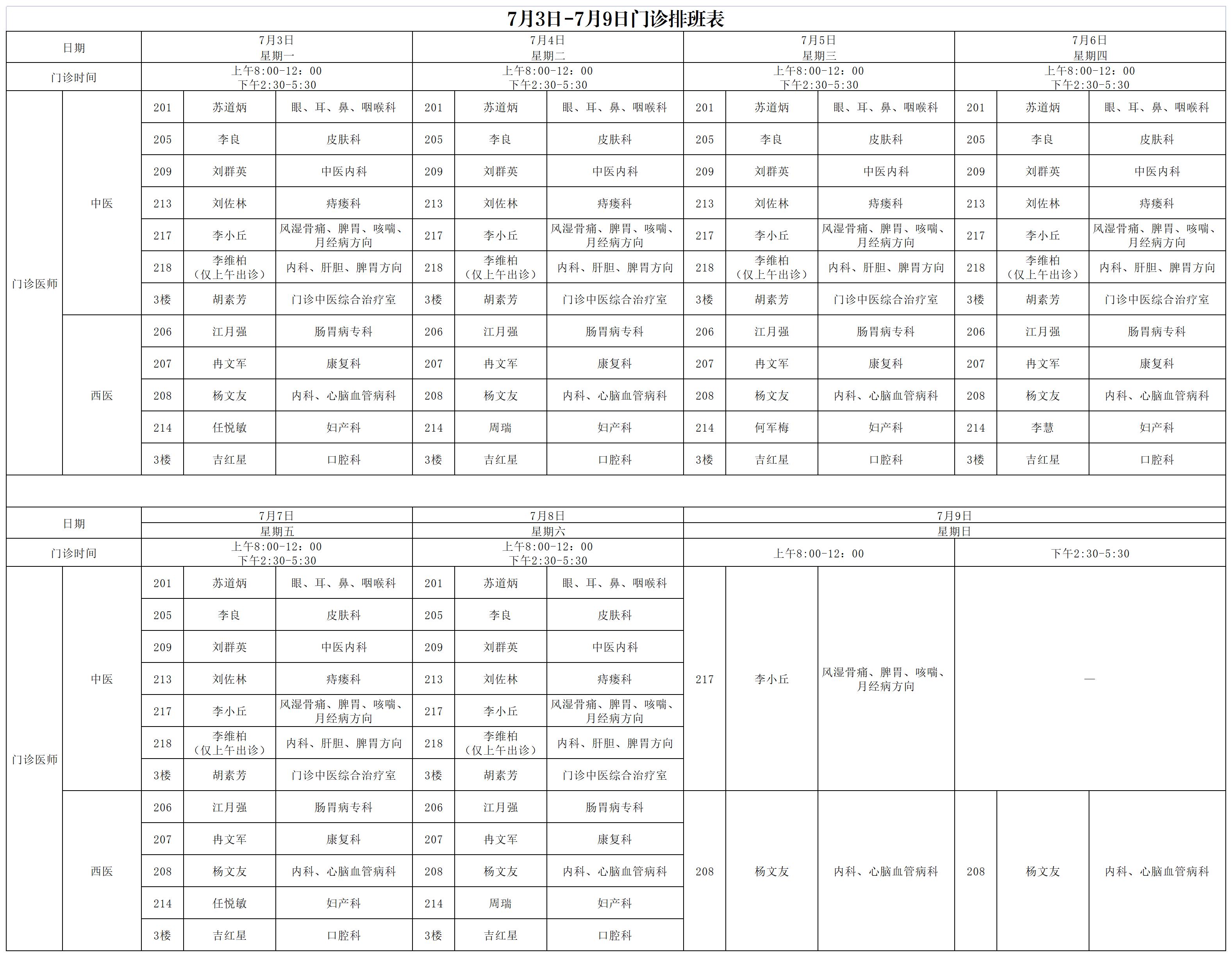 7月3日-7月9日门诊排班