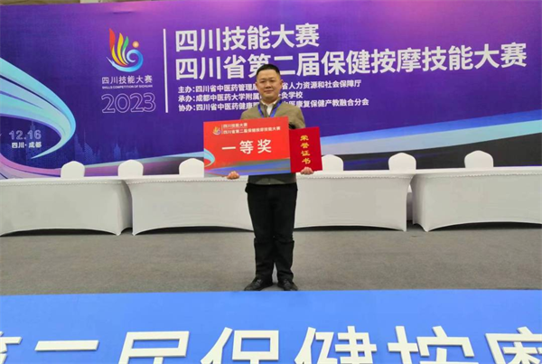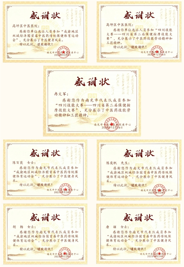 市中医药发展促进中心副主任杨兴明(右)、副书记吴必文(左)为他们颁发感谢状 2023年9月23日,我院陈百英、陈奕帆、胡杨、唐丽与市卫健系统2名运动员组成的南充市代表队,在成渝地区双城经济圈首届中医药传统保健体育运动会上,与来自川渝两地的60支代表队,700余名运动员同台比拼,荣获团体二等奖,健身气功·八段锦二等奖。 2023年12月15日-16日,医院副院长冉文军在四川技能大赛——四川省第二届保健按摩技能大赛中荣获一等奖。 感谢状是认可,是鼓励,更是责任。今后,我院将继续发挥中医药特色与优势,培养更多中医药人才,为人民群众提供更为优质的中医药服务。 |