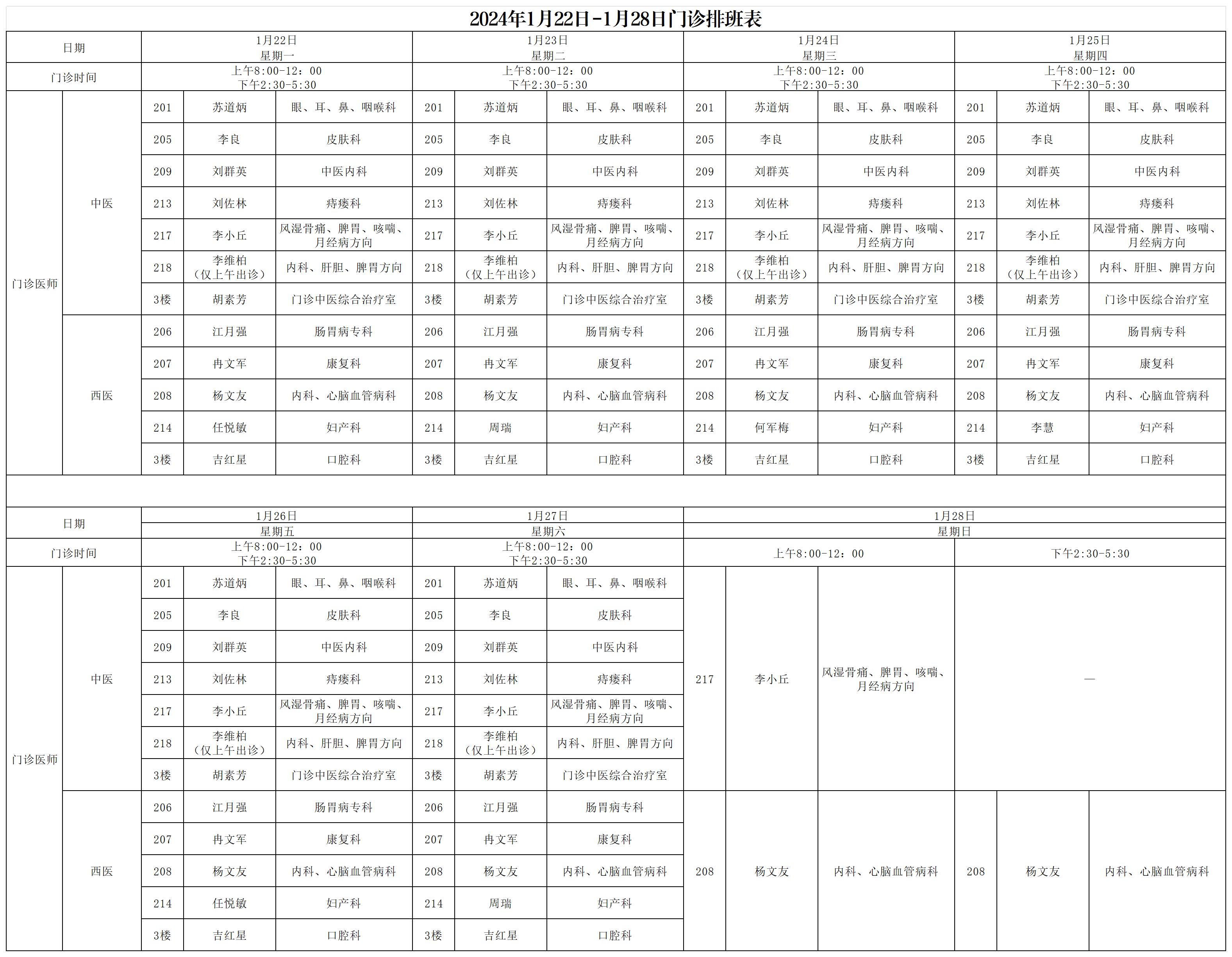 2024年1月22日-1月28日门诊排班