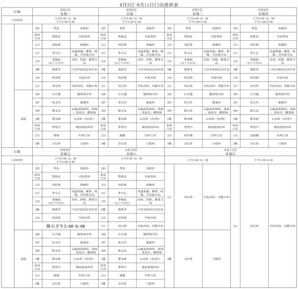 8月5日-8月11日门诊排班