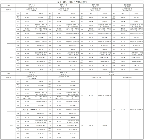 11月25日-12月1日门诊排班